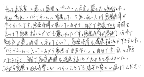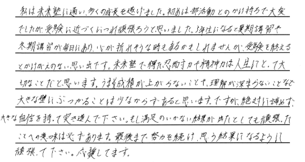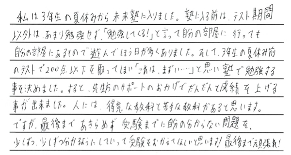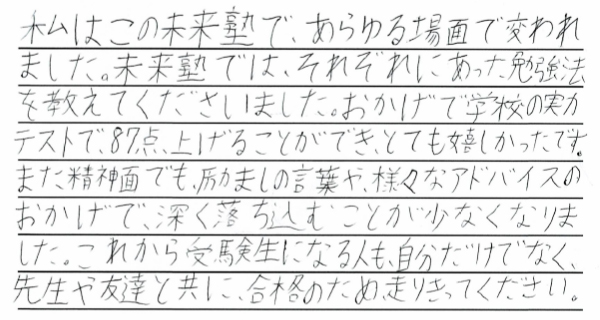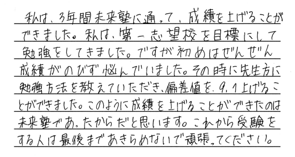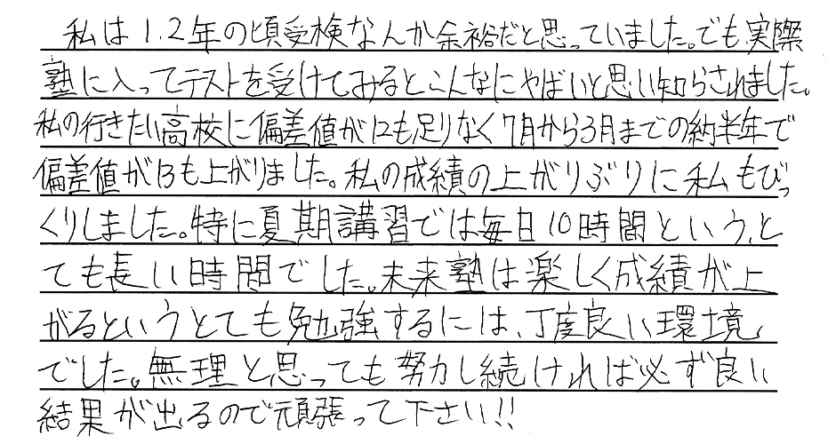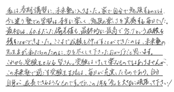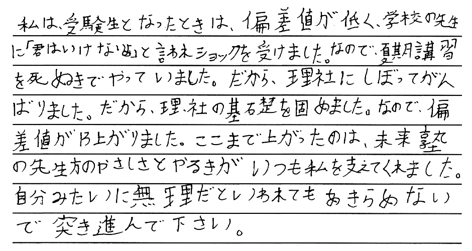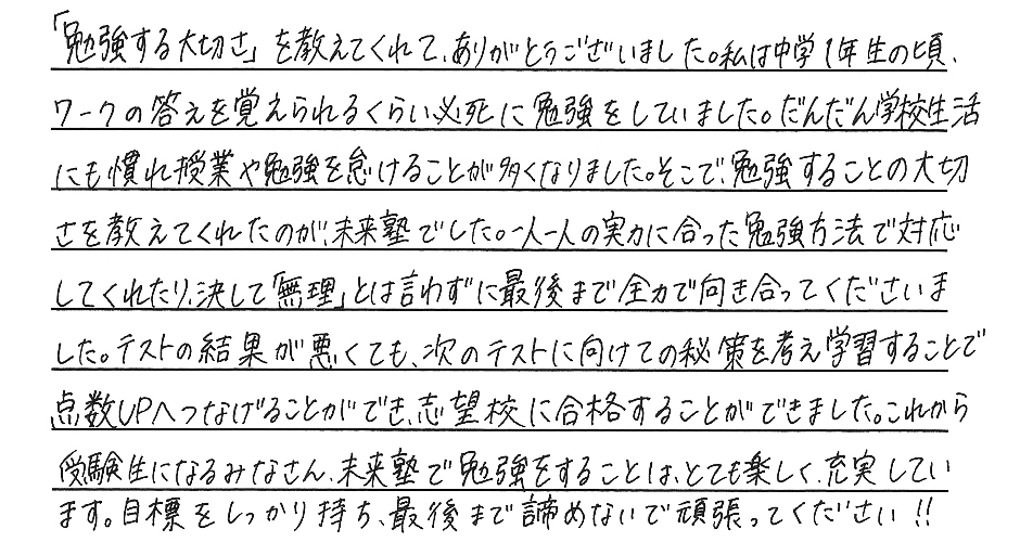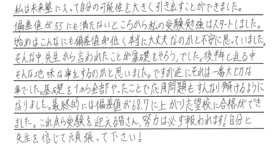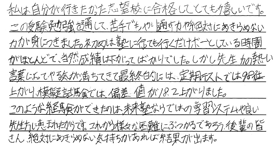 夢を叶えた私たちからみんなへ みんなたくさんの努力と笑顔をありがとう。新しいステージでのみんなの頑張りをずっと応援しています。 令和6年度卒業生の皆様 ※偏差値推移についていは、入塾時から県立一般受験までの期間に実施した下野模試から割り出した数値です。当塾卒業生たちの圧倒的な努力の賜物をご覧ください。 令和6年度 南犬飼中卒業 M.M.くん 宇都宮工業高校 建築デザイン科 合格 令和6年度 南犬飼中卒業 I.U.さん 小山城南高校 合格 令和6年度 南犬飼中卒業 Y.T.さん 栃木女子高校 合格 令和6年度 南犬飼中卒業 J.S.くん 宇都宮工業高校 電気情報システム科合格 令和6年度 南犬飼中卒業 T.U.くん 栃木翔南高校 合格 令和6年度 南犬飼中卒業 Y.M.さん 小山西高校 合格 令和6年度 南犬飼中卒業 M.S.さん 小山西高校 合格 令和6年度 南犬飼中卒業 K.I.くん 栃木工業高校 機械科合格 令和6年度 壬生中卒業 Y.K.くん 小山西高校 合格 令和6年度 南犬飼中卒業 R.A.さん 作新学院高校 総合進学特別進学 短期合格 令和6年度 南犬飼中卒業 M.T.さん 小山西高校 合格 令和6年度 南犬飼中卒業 M.I.くん 宇都宮南高校 合格 令和6年度 南犬飼中卒業 T.Y.くん 壬生高校 合格 令和6年度 南犬飼中卒業 S.F.さん 栃木翔南高校 合格 令和6年度 南犬飼中卒業 Y.N.さん 鹿沼高校 合格 令和5年度卒業生の皆様 令和5年度 南犬飼中卒業 K.S.くん 鹿沼高校 合格 令和5年度 南犬飼中卒業 K.H.くん 宇都宮南高校 合格 令和5年度 南犬飼中卒業 T.H.くん 小山高校 合格 令和5年度 南犬飼中卒業 H.H.くん 鹿沼商工高校 合格 令和5年度 南犬飼中卒業 Y.N.さん 栃木商業高校 合格 令和5年度 南犬飼中卒業 I.H.さん 足利高校 合格 令和5年度 南犬飼中卒業 I.K.さん 小山西高校 合格 令和5年度 南犬飼中卒業 M.H.さん 宇都宮中央高校 合格 令和5年度 南犬飼中卒業 S.S.くん 栃木翔南高校 合格 令和5年度 南犬飼中卒業 S.E.くん 足利高校 合格 令和5年度 南犬飼中卒業 A.H.くん 宇都宮南高校 合格 令和5年度 南犬飼中卒業 O.N.くん 壬生高校 合格 令和4年度卒業生の皆様 令和4年度 南犬飼中卒業 金子潤くん 宇都宮南高校 合格 令和4年度 南犬飼中卒業 綱島優衣さん 鹿沼高校 合格 令和4年度 南犬飼中卒業 森髙優那さん 栃木翔南高校 合格 令和4年度 南犬飼中卒業 野口蒼良くん 栃木高校 合格 令和4年度 南犬飼中卒業 小山悠斗くん 國學院栃木高校スポーツ特待合格 合格 令和4年度 南犬飼中卒業 田中青空くん 小山西高校 合格 令和4年度 南犬飼中卒業 鈴木健汰くん 宇都宮白楊高校食品科学科 合格 令和4年度 南犬飼中卒業 瓦井咲来さん 宇都宮北高校 合格 令和4年度 南犬飼中卒業 田中輝くん 壬生高校 合格 令和4年度 南犬飼中卒業 岩本優衣奈さん 栃木翔南高校 合格 令和4年度 南犬飼中卒業 伊藤真斗くん 宇都宮工業高校電気情報システム科 合格 令和4年度 南犬飼中卒業 髙橋きららさん 作新学院高校特待合格 合格 令和4年度 南犬飼中卒業 鹿児島美結さん 作新学院高校 合格 令和4年度 南犬飼中卒業 橋本龍ノ輔くん 栃木商業高校情報処理科 合格 令和4年度 南犬飼中卒業 川村尚大くん 花巻東高校スポーツ推薦合格 合格 令和4年度 南犬飼中卒業 岡本千明さん 栃木翔南高校 合格 令和4年度 南犬飼中卒業 寺内漣くん 栃木翔南高校 合格 令和4年度 南犬飼中卒業 栗原梓音くん 壬生高校 合格 令和4年度 南犬飼中卒業 坂本莉空くん 小山南高校 合格 令和3年度卒業生の皆様 令和3年度 南犬飼中卒業 西野桃香さん 鹿沼高校 合格 令和3年度 南犬飼中卒業 廣瀬虹光さん 栃木女子高校 合格 令和3年度 南犬飼中卒業 天間綾太くん 栃木商業高校 商業科 合格 令和3年度 南犬飼中卒業 後藤優歩さん 栃木女子高校 合格 令和3年度 南犬飼中卒業 小林大輝くん 栃木工業高校 電気科 合格 令和3年度 南犬飼中卒業 横山胡春さん 宇都宮中央高校 合格 令和3年度 南犬飼中卒業 伊藤來煌くん 石橋高校 合格 令和3年度 壬生中卒業 秋沢咲樹さん 宇都宮商業高校 商業科 合格 令和3年度 南犬飼中卒業 大木開世くん 宇都宮南高校 合格 令和3年度 南犬飼中卒業 宮原葵さん 栃木女子高校 合格 令和3年度 南犬飼中卒業 高田凱杜くん 宇短附高校 スーパー特待生 合格 令和3年度 南犬飼中卒業 宅原咲良さん 鹿沼東高校 合格 令和3年度 南犬飼中卒業 矢野大基くん 栃木商業高校 商業科 合格 令和3年度 南犬飼中卒業 諸橋怜娃さん 宇短附高校 合格 令和3年度 南犬飼中卒業 粂川莞佑くん 文星芸大附高校 合格 令和3年度 南犬飼中卒業 吾妻琥珀くん 宇都宮白楊高校 情報技術科 合格 令和3年度 南犬飼中卒業 宇塚美凜愛さん 小山城南高校 合格 令和3年度 南犬飼中卒業 大島広明くん 栃木工業高校 電気科 合格 令和3年度 南犬飼中卒業 飯塚悠太くん 宇短附高校 合格 令和3年度 南犬飼中卒業 斉藤理輝くん 壬生高校 合格 令和3年度 南犬飼中卒業 増子恵悟くん 宇都宮南高校 合格 令和3年度 南犬飼中卒業 吉川流海くん 宇都宮南高校 合格 夢を叶えた私たちからみんなへ みんなたくさんの努力と笑顔をありがとう。新しいステージでのみんなの頑張りをずっと応援